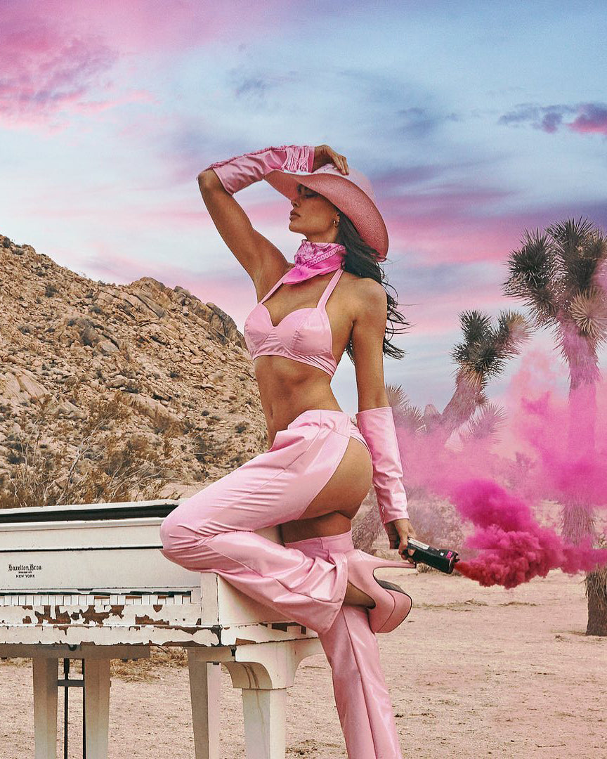 Get ready to rock in a western look that’s far from the dusty traditional cowboy outfits. This trendy and modern take on an old standby will ensure that you stand out from the crowds! Keep ‘em staring in this look that features a sexy and sleek vinyl pink fabric that begs to be touched. The bra style crop top has a halter neckline and molded cups that accentuate and enhance your bustline. Pair with the matching bikini style shorts that have tushy flattering ruching in the back, and the full length chaps. Finish off your look with the flirty fringe cuffs and pink bandana.