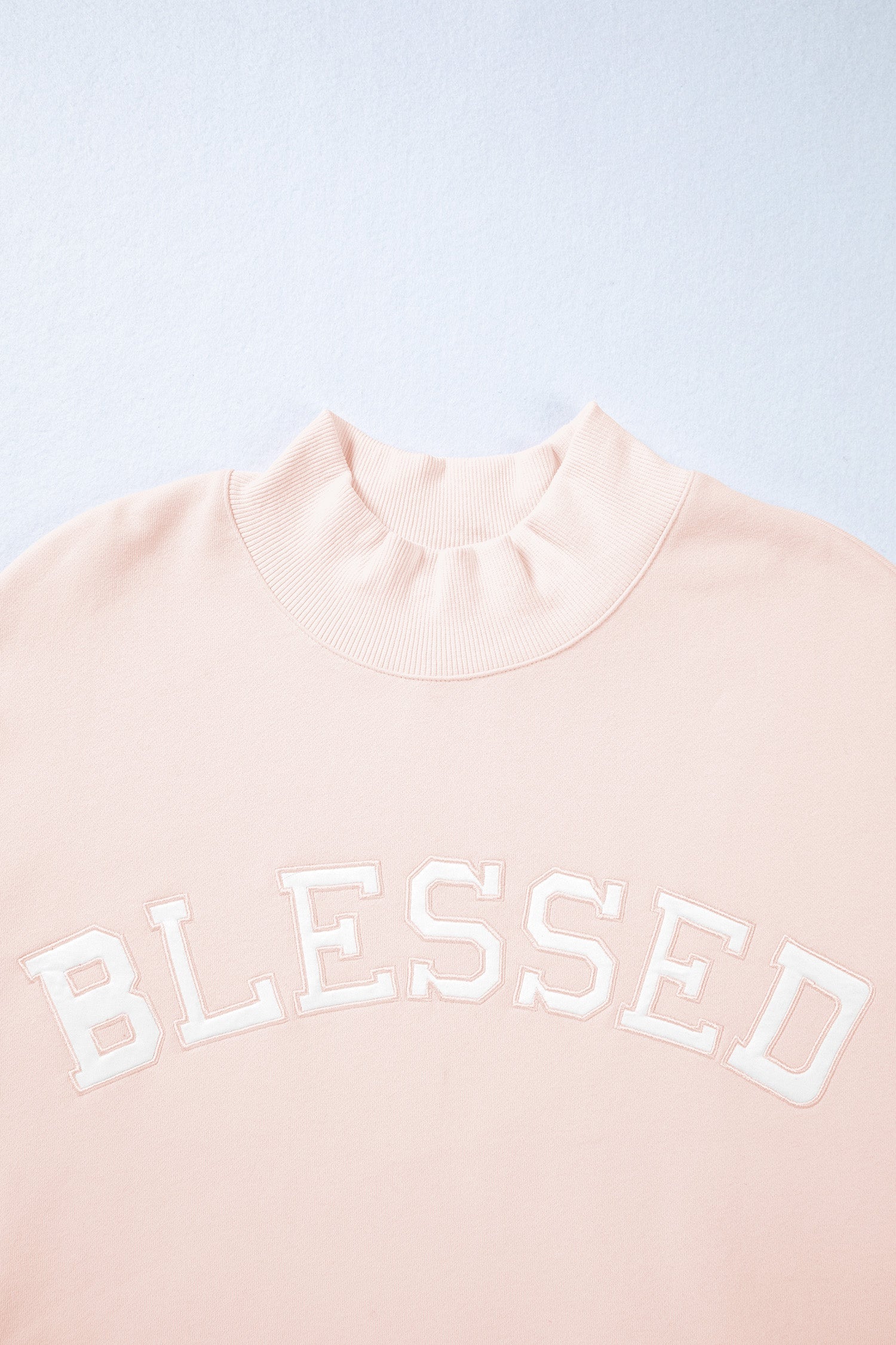 Reach for Sofia Blessed Embroidered Mock Sweatshirt whenever you want comfort, confidence, and simple styling. This baggy sweatshirt is cute with a light pink tone. The blessed embroidered graphic is perfect to make a statement. The mock neck design is classic and modest. Relaxed fit and casual for different body shapes.