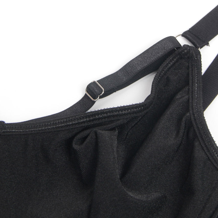 This bondage set includes a strappy cut bra with adjustable straps, panty, and a matching strappy garterbelt with adjustable garter straps. (Stockings not included.)