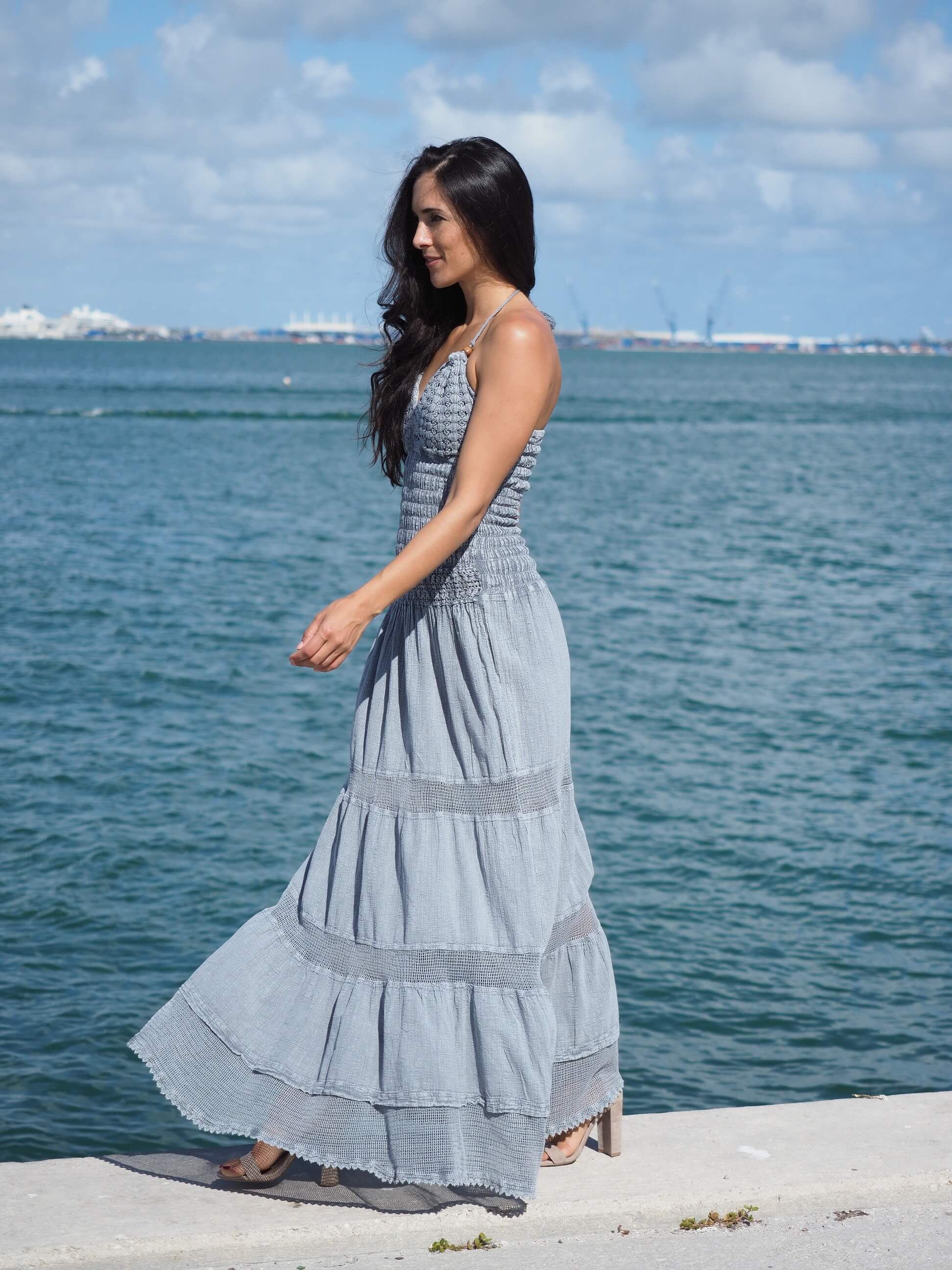 S E A S I C K women’s halter Maxi dress. This absolutely stunning dress has a crochet bust line with a twisted halter straps and a pom-pom. The bodice is an elastic panel for comfort. There are net panels throughout along with crochet detail. This stylish dress is made from the finest Peruvian Pima Cotton. Soft and comfortable with a breathable relaxed fit.