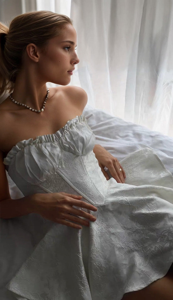 This jacquard, micro mini dress features a corset bodice with structured cups, a strapless silhouette, an exaggerated skirted bottom, and attached, ruffled lace shorts.