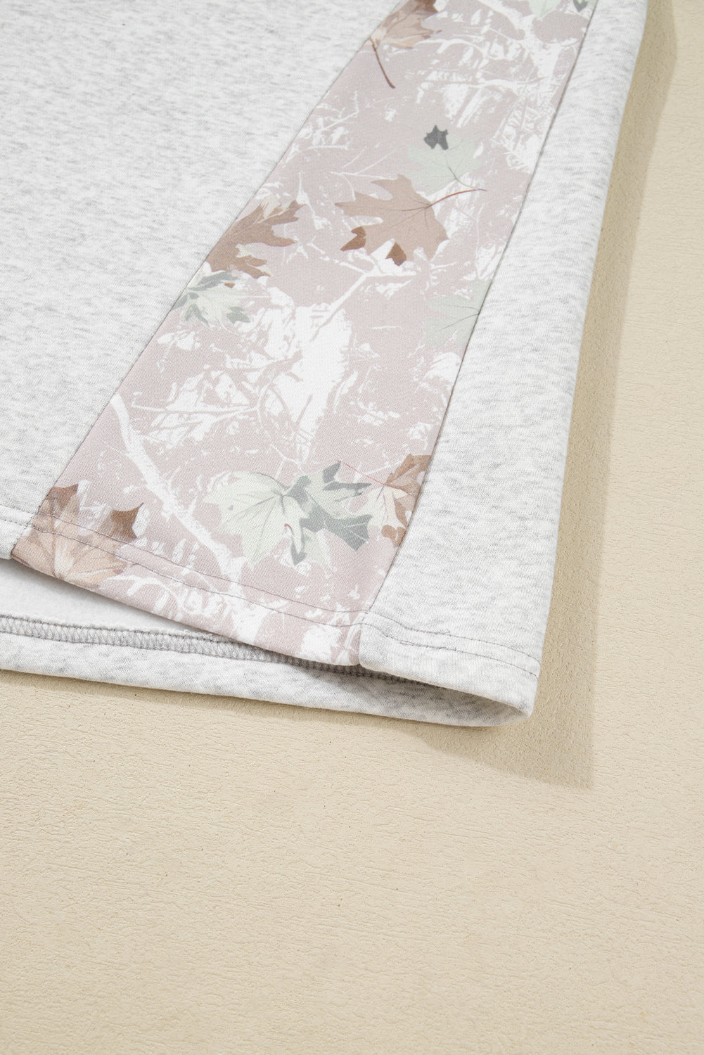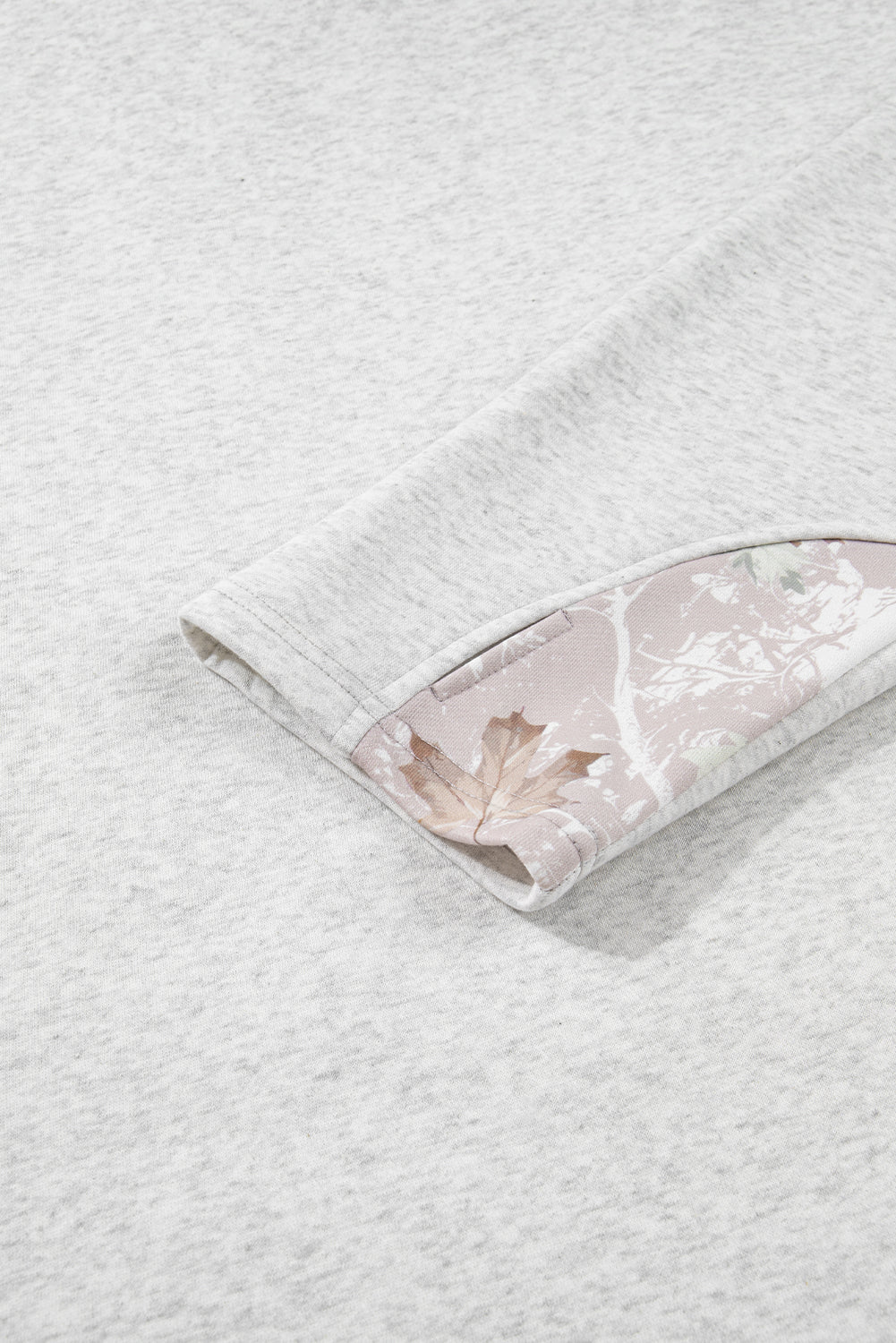 Meet Olivia Patchwork Zipped Collar Pullover—effortless, flattering, and easy to style for everyday life. The camo leaves patchwork gives this plus sweatshirt a unique detail. This chic sweatshirt features a convenient pullover style witha zipped collar. The thumb hole design is functional and adds chic detail. Pairs well with any jeans and casual pants for ladies. plus-size sweatshirts are stylish and comfortable.