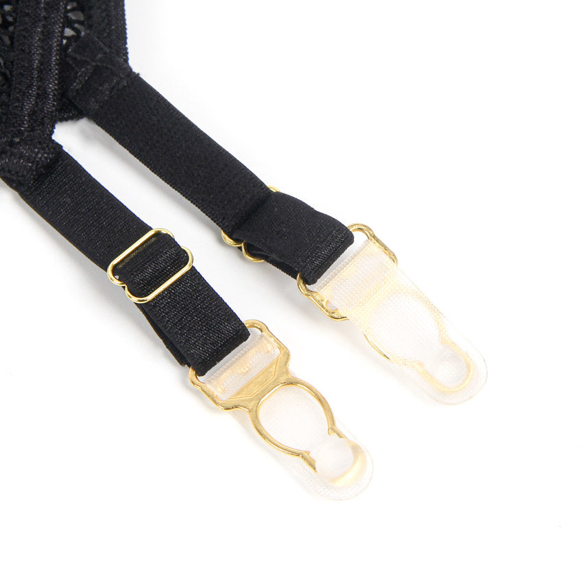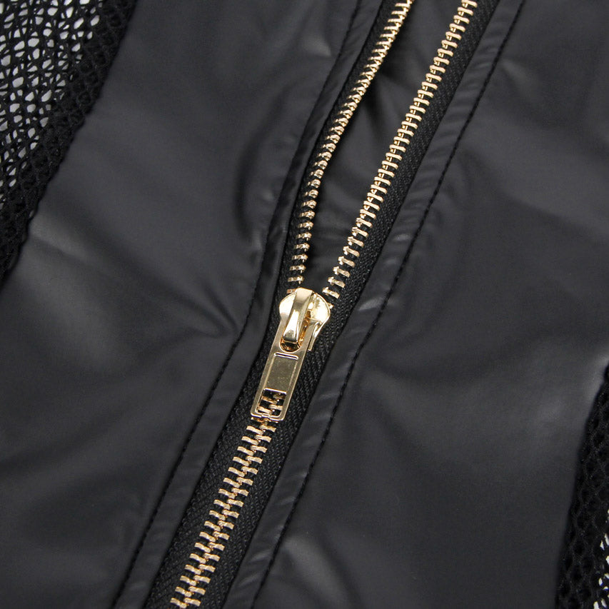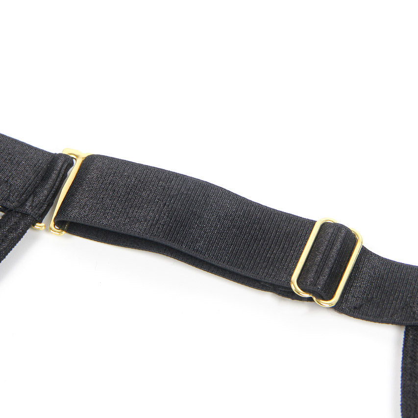 This black pleather chemise features a criss cross halter neck, a zip up front, and attached garter straps.